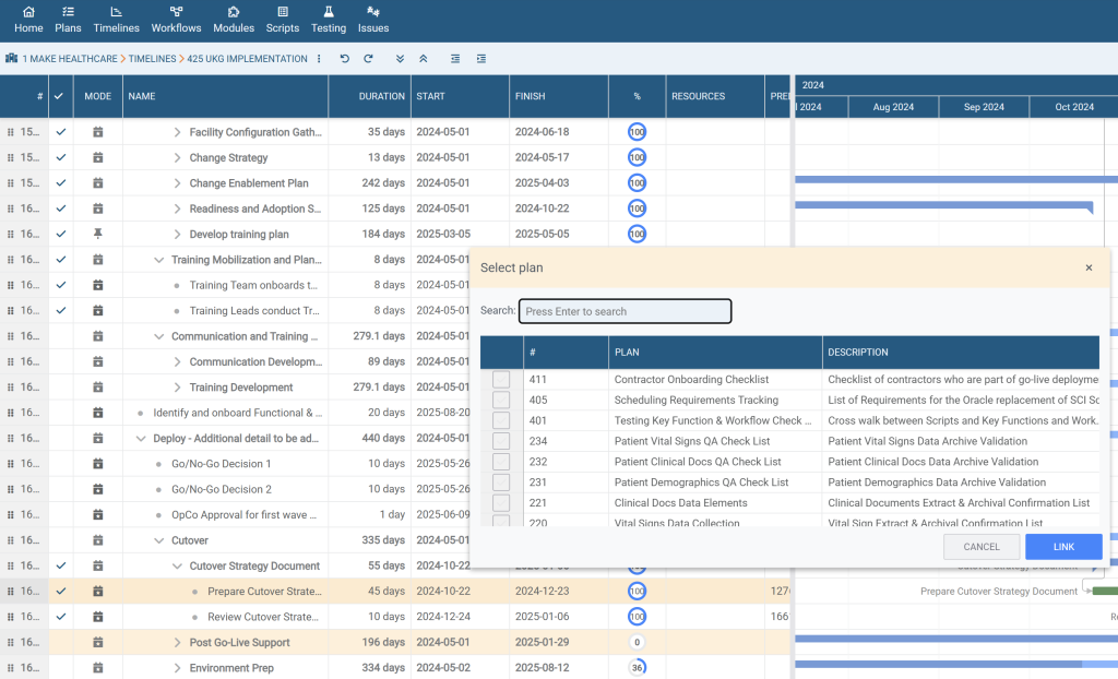 Link a Plan to a Timeline so you can track any task, activity, or checklist that's part of your overall project plan.